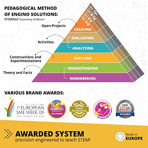 With Engino' s mechanics: wheels, axles and inclined planes set and learn how wheels and axles use friction to move objects easily and how big tires compare to small tires. Find out how an inclined plane can be used for lifting heavy objects and how another form of inclined plane, the wedge, is used in every day applications. Build 14 working models such as a launching platform, a door with knob, a well, an airport staircase, an experimental ramp and a splitting wedge. You can find easy-to-follow building instructions for all models either online or in the booklet included. The booklet provides detailed explanations of the different scientific principles applied and incorporates innovative experimental activities for hands-on learning. Features: a quiz section is also available to challenge your newly acquired knowledge! conduct thorough experiments and discover - how to gain mechanical advantage with large wheels - how the wheel and axle mechanism works as a lever - the relation between force and speed - the elements of an inclined plane and how these affect force and distance. - the Engino building system was invented by Costas Sisamos, a former teacher and engineer for the purpose of helping students build technological models creatively and easily to experiment and learn about science and technology in a way that includes all the benefits of play. Research grants from local and e.U. Sources helped transition the three year research project into an innovative product. Since then Engino has developed more snap-fit components such as gears, pulleys, motots, and solar panels. The major advantage of the Engino system is that it's design flexibility enables children to build simple or complex models quickly using a small number of components. Engino for ages 8 and up.