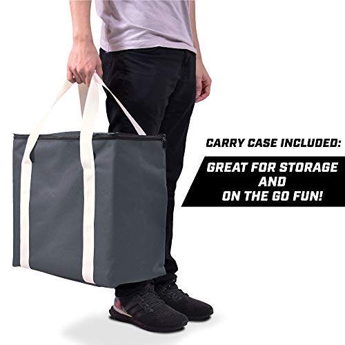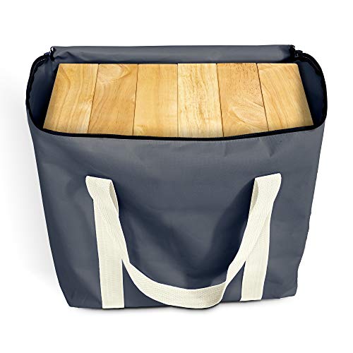 The set is made out of giant size premium hardwood blocks with smooth sanded edges. The Tower starts out at 2.25 ft tall and can grow to over 5 ft during games. Hardwood is incredibly durable and naturally shock absorbent making it great for hardwood floors, outdoor patios, sand, grass and more. The object is to pull blocks out of the body of the tower and replace them at the top without the tower falling over. The game includes a robust canvas carrying case so you can neatly store the set or bring it with you anywhere. This is by far the best giant toppling tower game available and comes with a 100% satisfaction guarantee.