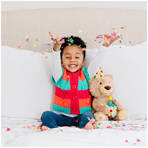 This bear is ready to bring the party! With a squeeze of its paw, this adorable 10” teddy bear comes to life and sings a happy birthday song, moving its mouth and swaying in time to the music. He wears a colorful polka-dotted party hat and holds a matching multicolored cupcake in his hands, which has an LED candle that lights up with a gentle glow while he sings. The bear is designed with safe embroidered details and designed with a warm, charming smile and expression that makes him the perfect gift for cuddlers of every generation and taste. NOTE: On/Off switch located on the bear’s paw. 3 AA batteries required (included). Surface washable. Please note that this product includes a pull tab, which is secured to the battery compartment located on the bottom of the plush. This tab prevents the plush from activating during transit, and must be removed before attempting to activate/turn on the bear.