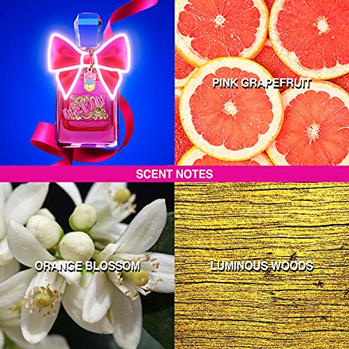 Let extravagance come alive with a neon burst of pink and over-the-top glam. Viva La Juicy NEON beams bold & bright. Our cheeky queen bee is never in the dark, she lights the way with a Neon pop of pink. She enters the fantasy world she’s been craving & gets together with friends in Viva La Juicyland. Pink everything up a notch, turn up the glamour in a day-glow heaven that goes neon and on. Hot pink gets hauter to light the way to shine your brightest. #PINKITUP! Blazing and modern, this luminous floral, fruity, woody perfume brings haute floralcy with pops of petals and glowing fruits that light up the room. Exuding a beaming sensuality, this bright, bold fragrance opens with zesty pink grapefruit on top of an orange blossom heart that leads to a warm tonka finish.
