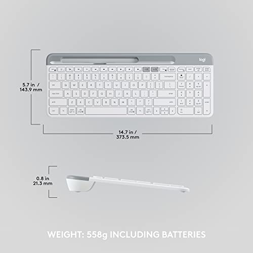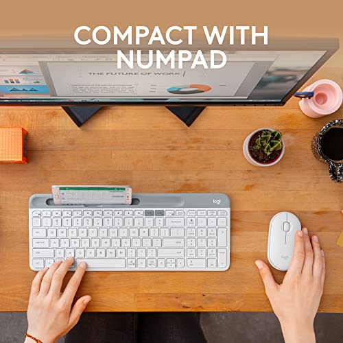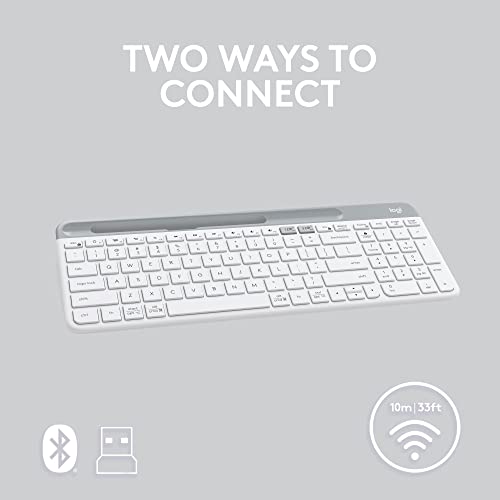 MINIMALIST. MODERN. MULTI-DEVICE. Own your space with the Logitech K585 Multi-Device Slim Wireless Keyboard – the versatile, design-forward keyboard that fits your curated lifestyle. The compact footprint and sleek modern design bring beauty, comfort, and functionality to any personal, work or office space. WORK SEAMLESSLY WITH EASY-SWITCH. This computer keyboard also works with your smartphone and your tablet. The Easy Switch buttons let you pair and switch between multiple electronic devices. So, you can type on your computer and your phone — which can be placed on the built-in phone cradle for even better multitasking. Connect the way you want via the 2.4 GHz USB receiver and/or Bluetooth wireless technology. WORKS WITH YOUR OS. Use the Logitech keyboard to type on your multiple devices — laptops, tablets, desktops and smartphones. The layout is optimized for both Windows and Mac OS commands. SPACE SAVING PRODUCTIVITY. A compact design helps you get the most out of your workspace. With a numeric keypad and all the keyboard keys you need for great productivity right at hand, there’s less arm extension, so you can work comfortably for longer. 12 FN keys for easy access and media shortcuts. Boost your productivity by customizing your experience with Logi Options+ Software. WHISPER-QUIET TYPING. Slim keyboard switches provide fluid laptop-like typing and ultra-quiet work experience for you and those around you. 24 MONTHS OF STRONG, RELIABLE WIRELESS. Enjoy long battery life (2) thanks to an auto-sleep feature that kicks in when you’re not typing — plus a strong, secure wireless range up to 10m (1). (1) Battery life may vary based on user and computing conditions. (2) Wireless range may vary based on environmental and computing conditions. (3) Latest Logi Options+ version needed