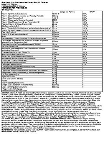 NOW EVE Women's Multivitamin tablets are specially formulated to be a superior daily multi to help bridge the nutrient gap in women's daily diets. The particular formula includes cranberry, alpha lipoic acid, and CoQ10 as well as superfruits (pomegranate, acai, and mangosteen). Take 3 tablets daily with food.