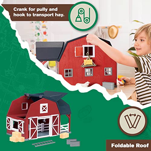 Your child will spend quality screen-free time playing with this 20-piece wooden animal barn from Terra by Battat. One of the fun added features includes turning a crank that lifts bales of hay up to one of the barn loft windows while helping to develop fine motor skills. The wooden toy barn will spark your child’s creativity and helps to promote imaginative play. For easier play access to the inside of the barn, the barn doors open wide and the roof opens up to fold back. This wooden barn set makes a perfect birthday or holiday gift! Recommended for children ages three and up. Animals sold separately. Purchase a set of Terra by Batta farm animal figures to accompany the barn.