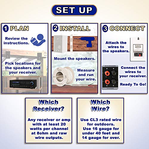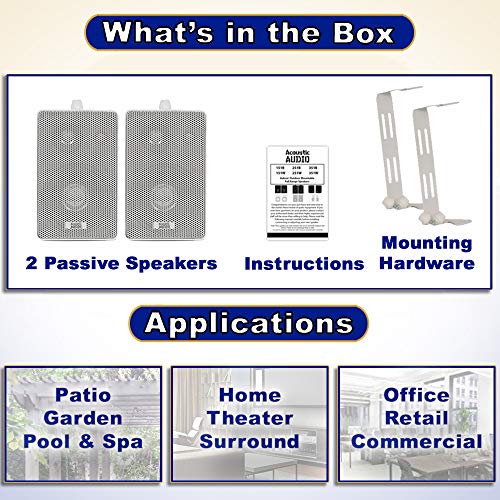 These are the perfect speakers for any occasion or application Because they are water-resistant and can withstand all weather conditions. They were designed with durability in mind, so there's no need to worry about rust or wear-and-tear. Use them on your deck or patio, by the pool, or in your garage. They also make great additions to any surround sound home theater, will fit onto any bookshelf, can be used with any PA system and are great to use In bathrooms and kitchens. Each speaker can handle 200 watts of power (100W RMS), and has a three-way design and functionality. They feature a 4" Poly dynamic cone woofer, a 2" Mylar dome midrange, a 1/2" Mylar dome tweeter, a butyl rubber surround and a steel mesh grille. Included are mounting brackets, which provides for hassle-free installation in any location.