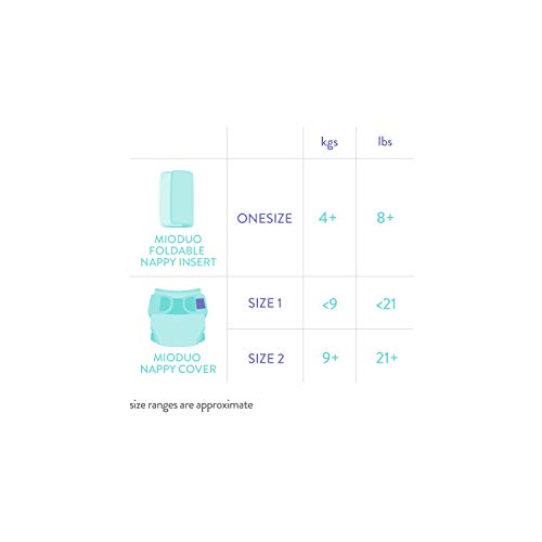 Bambino Mio's mioduo two-piece diaper has a onesize prefold diaper and two sizes of diaper cover that will see you through from baby to toddler. These award-winning diaper covers are super soft and stretchy, made from lightweight fabric to allow your baby freedom to move and explore. Every part of this product is OEKO-TEX® Standard 100 certified – the leading global certification for textiles that have been independently tested for harmful substances and guarantees the safety of the materials used in our products. Machine wash hot up to 140°F. Do not use chlorine bleach. Do not use fabric softener. Do not iron. Do not dry clean. May be tumble dried cold/low. To get the best out of your diapers, Bambino Mio recommend washing them warm at 104°F with enzyme-free laundry detergent and one scoop of Bambino Mio's natural laundry treatment (1 oz). Air dry your diapers away from direct heat. Washing at higher temperatures and frequent tumble drying can result in premature deterioration of your diapers. True for most babies but due to a wide range of shapes and sizes this cannot be guaranteed.