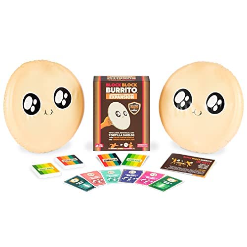Introducing the Block Block Burrito Expansion, an exciting addition to your favorite food-based dodgeball card games, Throw Throw Burrito or Throw Throw Avocado. Perfect for family game nights, this game features 2 inflatable tortilla shields, 36 Burrito Battle Cards, and 36 Avocado Battle Cards that enhance the fun and action in your card games. A great gift for boys and girls aged 7+, this taco and burrito game is ideal for birthdays, holidays, or special occasions. The easy-to-follow instruction manual ensures players can quickly learn the rules and start enjoying the game, making it suitable for both beginners and experienced gamers. Portable and durable, the Block Block Burrito Expansion is perfect for beach games, backyard parties, and more. Keep the inflatable shields in top shape with the 2 included repair patches. Bring the fun and excitement of Block Block Burrito to your next game night!