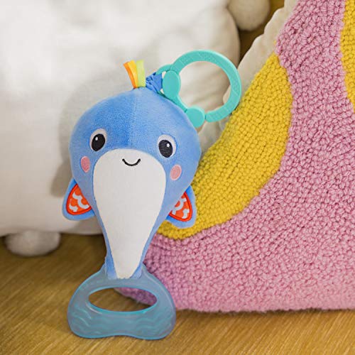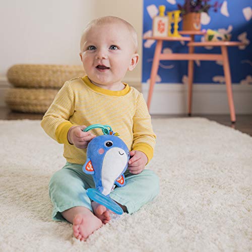Playtime is a whale of sensory silliness with the whale-a-roo from Bright Starts. Surprise baby with cause and effect by pulling on the whale tail for vibrations or giving it a shake for fun chiming sounds. Explore bright colored ribbons and crunchy crinkly textures. This plush take-along toy brings plenty of activity on the go.