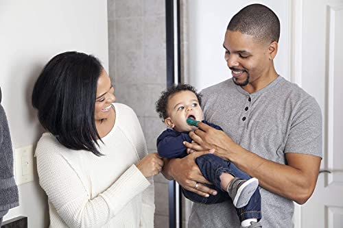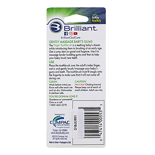 "Teething babies need relief from teething pain, as well as good oral care and they get both with Baby Finger Toothbrush from Brilliant Oral Care. Babies 3 months old and up will experience Teeth Eruption & Development, the time when baby teeth begin the journey through the gums, when the teething process has begun. The Finger Toothbrush helps soothing sore gums and pain of teething by massaging tender budding gums, with healthy bonus of being able to brush new baby teeth. The caregiver puts the Brilliant Finger Toothbrush over their finger and can clean baby’s mouth by either cleaning baby teeth or massaging and soothing baby's gums. Place toothbrush over adult’s index finger, wet it and gently brush/massage baby’s gums and teeth. Toothbrush must fit snugly onto the fingertip to make sure that it will not come out during use. Designed for babies and 100% food grade silicone make the Finger Toothbrush safe and easily washable. Its two sided design provides several purposes: the massaging bumps massage and clean the gums and tongue, the soft brush cleans the teeth. Made of soft, flexible material indicates a good teether that can also be chilled to relieve soreness in baby’s sensitive mouth."