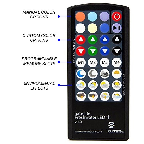 Custom color from your couch Now you can shift the color of your aquatic environment without shifting your body with the industry’s first freshwater-optimized, RGB+White, wireless remote controlled LED fixture. Super bright 6500K White LEDs are paired with full-spectrum RGB LEDs to offer every color under the sun (and a few that aren’t) all controlled from a single 32-key customizable remote. Game-changing effects Ready to enter the world of countless possibilities? The Satellite LED+ features effects that you’ll have to see to believe, plus each color is individually adjustable for endless custom color blends. Features include: 6, freshwater-optimized, color pre-sets 12, dynamic effects including: cloud cover, fading lunar, storm, lightning, dusk and more 4, memory buttons for saving custom color blends Pause/play each mode on-demand. The perfect fit Sliding docking legs allow quick and easy adjustments for a wide variety of installations. This system also makes adding multiple fixtures a snap. Low voltage, super safe LEDs Low, 12V DC, IP65 rated LEDs making them super safe for aquarium use. 120 degree dispersion angle for optimal spread and color blending.(see chart below for specs) Pick a color, any color With so much hype into the industry, we decided it was time for a game-changer – reinvent the freshwater aquarium. Drawing on our years of expertise in both fresh and marine aquarium product development we have created another industry first – a full-spectrum, wireless remote controlled, customizable fixture that was engineered from the ground up for freshwater aquarium environments. Making it the perfect choice for a beginner setting up their first tank, or a seasoned veteran looking for a significant upgrade. Each Satellite LED+ Includes: • 1 Satellite LED+ fixture • 2 Adjustable docking mounts • 1 12V DC UL transformer • 1 Wireless LED remote control