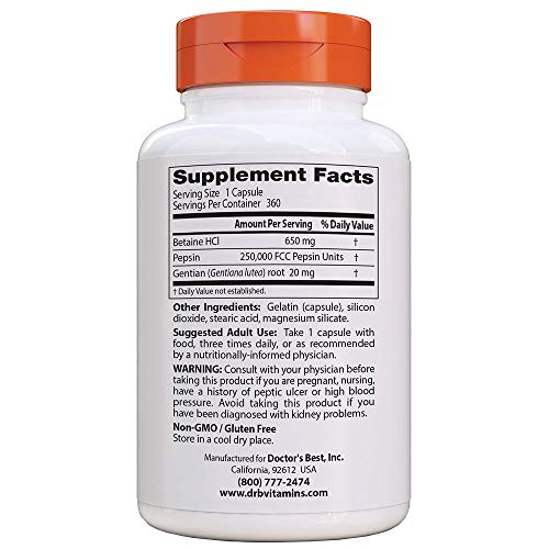 Doctor's Best Betaine HCI Pepsin and Gentian Bitters, Digestive Enzymes for Protein Breakdown and Absorption, Non-GMO, Gluten Free, 360 Count (Pack of 1)