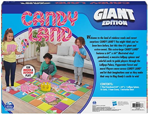 Welcome to a life-sized land of rainbow roads and sweet surprises: CANDY LAND™ Giant Edition! Unfold the large, 64” x 64” vinyl gameboard and open up your kids’ imaginations with illustrations of a colorful, magical CANDY LAND. In a game as big as this one, players become the movers! Spin the large Lollipop Spinner and move to that color on the board. If you reach the Peppermint Forest, Lollipop Palace, or one of the other Neighborhoods, collect a Card. Once you’ve collected 4 Cards, make your way up the Rainbow Road. The first player to reach King Kandy’s Castle wins and gets to wear the King’s foam crown! With simple rules and no reading required, CANDY LAND teaches younger kids color recognition and turn taking while letting them play in an imaginative, magical world. CANDY LAND is for 2 to 4 players, ages 4 and up.