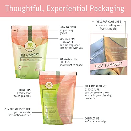 Save time and money with Grab Green 3 in 1 Laundry Detergent Pods. These concentrated pods feature a superior detergent, remarkable stain remover and beautiful brightener, all in one convenient pre-measured powder pod. Tackle your most difficult laundry challenges, without harmful toxins or carcinogens. Our relaxing lavender with vanilla fragrance is made with lavender, lavandin, patchouli and eucalyptus essential oils. Our thoughtful packaging includes a convenient, easy to use velcro closure and clear use instructions. We believe in full ingredient disclosure—what we call True Transparency—which is why we list every ingredient and the purpose for each ingredient on every package. To protect your family, we developed our powder pods to contain multiple layers of safety: simple, white powder pods don't look like irresistible colorful candy. They are difficult to swallow. Grab Green is a female and mother owned and operated company that provides naturally derived and non-toxic laundry, home cleaning, and personal care products 100% made in the USA. Our products are eco-responsible and ensure safe and effective cleaning power for a healthy, happy home.