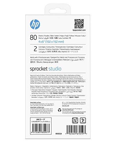 4 x 6 inch format instant photo prints, exclusively for Sprocket Studio printer. Not compatible with Sprocket, Sprocket Plus, Sprocket 2-in-1, or Studio Plus. The 4 x 6 inch (10 x 15 cm) size is designed exclusively for Sprocket Studio, and is perfect for showcasing your favorite photos. This photo paper is specially designed to ensure you get bright, glossy photos with vibrant colors every time you print. Photos that last up to 100 years. Get enough cartridges and photo paper to create 80 high-quality photo prints. HP sprocket 4 x 6” (102 x 152 mm) photo paper and HP sprocket supplies packaging are responsibly sourced from managed forests. What's in the box: 2 cartridges and 80 sheets of 4 x 6 inch format glossy photo paper.