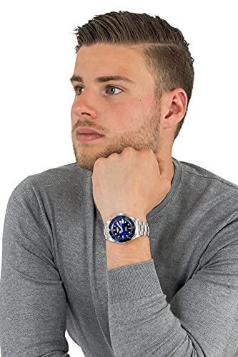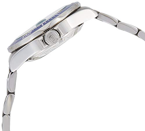 Invicta's Pro Diver automatic watch (model 9094) is perfect for the serious diver who also wants to turn heads with a stylish watch. This precise timepiece features a solid silver stainless steel case that measures 40mm (1.57 inches) wide, with a blue unidirectional rotating bezel with silver markings and coin-edged, scalloped highlights. It has a deep blue dial background with luminous Tritnite hands (with seconds hand) and dotted luminous dial markers with small minute indexes. The silver stainless steel bracelet band mixes brushed and polished links and is joined by a diver's buckle and safety clasp. Other features include date function at 3 o'clock and water resistance to 200 meters (660 feet).