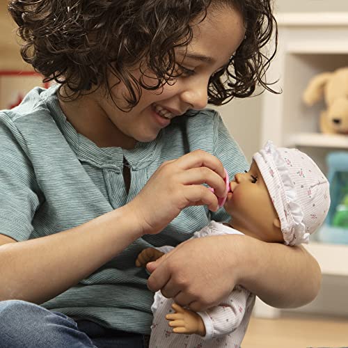 This huggable, lovable baby doll is the ideal size to cuddle. Mariana has molded plastic hair, and her beautiful brown eyes open and close. She can even sit up like a big girl. Her pretty rosebud clothing is removable for dressing and undressing fun, and she can suck her thumb or the included pacifier. This baby doll is 12” tall. Mariana is a beautiful baby doll that promotes imaginative play and encourages toddlers and young children to express themselves. Playing with baby dolls helps children develop fine-motor and cognitive skills as they practice dressing them, removing clothing, and helping baby Mariana to suck her pacifier and thumb. Kids can also develop strong language skills by talking to their precious baby. Our cuddle-and-carry baby doll for children features wipe-clean arms, a removable smocked romper, and matching cap. Mariana closes her beautiful brown eyes as she is rocked to sleep. The Mine to Love Mariana 12-Inch Baby Doll with brown eyes makes an ideal gift for children from 18 months and up. Add the Melissa & Doug Baby Food and Bottle set to round out the pretend play experience and give kids another engaging option for screen-free fun. For more than 30 years, Melissa & Doug has created beautifully designed imagination- and creativity-sparking products that NBC News called “the gold standard in early childhood play.” Today, Melissa & Doug is proudly partnering with the American Academy of Pediatrics to foster early brain development and help children build important life skills through play.