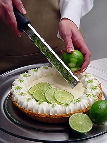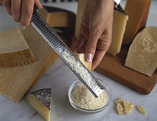 The blade is designed with a specific tooth set that takes the flavorful rind directly off the citrus fruit, while leaving behind the bitter white pith. Zest adds flavor to vinaigrettes, stir fries, salads, and baked goods! Grate Cheese: Grate parmesan into fluffy mounds that melt quickly and look beautiful when treating yourself of family to rustic bowls of pasta. Sprinkle fresh parmesan over eggs, salads, or any dish for a burst of flavor. Surgical Grade Stainless Steel: this material stays rust-free and maintains sharpness over time. True stainless steel is magnetic, so this item can be hung on your magnetic knife strip. Dishwasher Safe: The tool is easy to clean, simply rinse immediately after use. Use a kitchen brush on the underside of the blade to clean out tough to reach particles. The zester/grater can also be placed in the dishwasher. This tool is normally used to grate citrus for perfect lemon, lime, and orange zests or to create pillowy mounds of Parmesan cheese. Microplane Premium Classic Zester Graters A versatile must-have tool for the kitchen! This tool is normally used to grate citrus for perfect lemon, lime, and orange zests or to create pillowy mounds of parmesan cheese. However, it is also a great tool for grating spices like nutmeg, cinnamon, and even chilies into fresh ground powders. If your dish requires fresh grated ginger or garlic, this tool will do that job as well. Customers have let us know that they even use this tool to remove burnt edges from cookies and bread. What will you use it for? What is the difference between Original Classic and Premium Classic? The Premium Classic Zester Grater by Microplane provides a soft touch handle, instead of hard plastic. In addition this line provides a choice of handle colors. You can expect the same grating or zesting experience with either tool. Why is Sharper Better? Food is grated or zested without ripping or tearing which improves the look of the final dish Food is grated or zested without bruising which improves flavor and aroma Less pressure is required while grating - making the task faster and more efficient What makes Microplane so sharp? Microplane Blade Enlarged 50x View larger Do Chef's use Microplane? The Microplane is the standard for sharp, efficient grating and zesting in both home and professional kitchens - just ask any chef if they use a Microplane! Dining out anywhere will usually lead to a Microplane sighting. Photo-etching and surgical grade stainless steel Microplane began using this signature technology in the 1990's. Most tools use stamped or cut metal. Photo-etching creates a much finer point, which means your Microplane digs in and performs better.