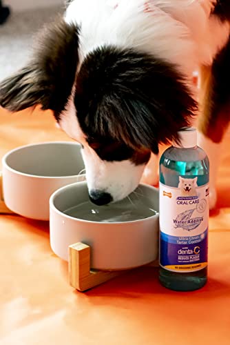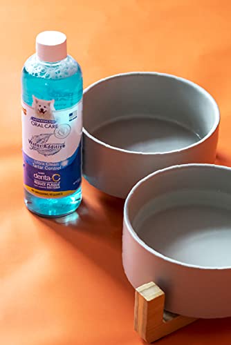 Cleaning your dog's teeth is as easy as taking a drink! Add Advanced Oral Care Water Additive Liquid Tartar Remover for dogs to your pooch's water bowl and help them enjoy fresher breath and cleaner teeth. Our dental care formula contains Denta-C, which is scientifically formulated to help reduce plaque that harbors bacteria by altering the pH of your dog's saliva. Just one tablespoon of our liquid tartar remover is all it takes to help lower the risk of periodontal disease. Use this veterinarian-recommended dog oral care solution to complement regular brushing or use it on its own for easy daily maintenance. ;.