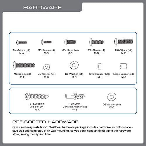 The QualGear qg-tm-a-012 is a UL listed full-motion wall mount for most 23 to 55 inch LED, LCD flat-panel TVs weighing up to 77 lbs. The arm can be stretched up to 20 inches and the three pivot points give a full range of movement to Perfect your screen display - Pan through 90 degree left or right and +10 degrees degree tilt. This pre-assembled arm comes complete with integrated cable management and decorative covers to ensure an elegant and tidy look. Its built-in level adjustment offers 3 degree clockwise and counterclockwise turning to ensure it is perfectly level. Compatible with VESA mounting hole patterns from 75x75 and up to 400x400.