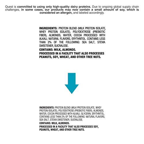 Due to global supply chain issues, Quest™ recently reformulated some of its products to contain soy lecithin and/or vegetable oil including soybean which is considered an allergen. The small amount contained within the product will not change the quality, flavor or texture of the product. We remain committed to using the high quality dairy-based proteins to help give you the amino acids you need. Brand Story By Quest Nutrition.