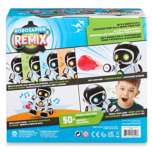 Meet Robosapien Remix! He’s 4 robots in 1 and mixes them up for fun so you never know who you’re going to get! Remix likes to change his mind all the time! Whether he’s an Excited Robot (White LED), Silly Robot (Green LED), Serious Robot (Blue LED), or Confused Robot (Orange LED), Remix keeps you entertained with 50+ sounds and reactions. Tap, shake, and push his buttons to see what makes him tick! And he has a few tricks up his sleeve! Remix packs a punch with 4 Swappable Arm Launchers including his Claw, Mega Fist, Boxing Glove and Plunger. When he’s not standing guard, he boogies to his own beats! Watch him shuffle, shimmy, and step to show off his Remix Dance Moves. Then get ready to giggle! With Remix’s Repeat Voice Warp, make him say anything for big laughs or hilarious pranks! Inspired by the best-selling Robosapien robot toys from WowWee, he’s a robot reboot, remixed for a new generation! Requires 4 AAA batteries (not included). For boys and girls ages 5 and older.