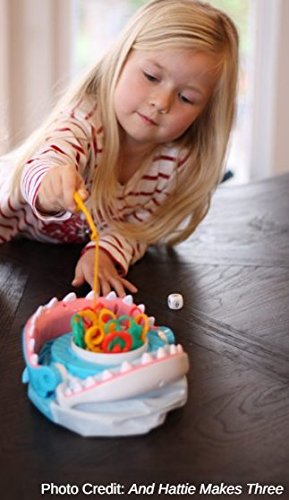 Get ready to have a REEL-y good time when you play Shark Bite! Place the fun and colorful sea creatures into the game unit with a snap, and grab your friends to start playing. Players take turns rolling the die and fishing for the sea creatures using the fishing rods. But watch out - you never know when the shark is going to bite! This battery-free game will have kids hooked at first bite! Made by the o-FISH-cial creators of Let's Go Fishin'. Includes 1 hungry shark, 12 colorful sea creatures, 2 fishing rods, 1 die, 1 sticker sheet, and complete easy-to-follow instructions. For 2-4 players, ages 4 and up.