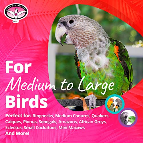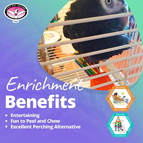Bright colors instantly attract the attention of birds; It is an instinct that draws them towards the many colors of nature. With their beaks, they also find satisfaction in shredding, biting, and chewing objects. Super Bird Creations has designed a fun and attractive toy to satisfy your pet bird: the paper party toy for large size birds. This multicolored, heavy duty set of paper lollipop sticks tightly rolled and tucked into a colorful wooden base is the perfect bird cage accessory. Simply attach it to the side of your Parrots cage and watch as it happily Bites, chews, peels, and shreds The bright yellow, Blue, orange, green, purple, and red paper sticks. You can also hide seeds among the paper sticks and see the foraging instincts of your bird emerge.