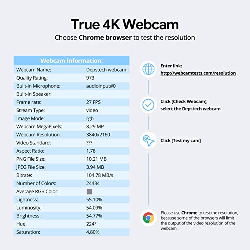 【Solid 4K Streaming & Full HD Video】High-definition 4K 8-megapixel PC external webcam with 1/3”CMOS Sony image sensor features up to a 3840*2160 resolution at 30fps. Our DEPSTECH PC web camera supports full HD video calling over the internet without any delay that makes you feel as if you're conversing in person face to face. DEPSTECH 4K webcam can be also used as a gift for your family or friends.,【Autofocus Webcam】In the era of remote meetings, the autofocus webcam was a must-have that works great. DEPSTECH Webcam has a face tracking mechanism that keeps in focus the person and removes the distraction of unwanted objects, showing details clearly and streaming clear video even in low light conditions. Perfect for webinars, zoom meetings, PC video conferencing, streaming online classes, etc.,【Dual Mics & Noise-Canceling】With digital noise filtering technology, DEPSTECH DW49 web camera with dual microphones can pick up your voice and filter out background noise automatically, enabling you to enjoy a clearer voice for hassle-free communication. Even in noisy surroundings, you can capture the sounds you want.,【Privacy Cover & Tripod & Stickers Included】The privacy cover not only protects your privacy security but also prevents the lens from dirt and debris. Add 4 types of stickers that provide you with freshness and interest in work and life, especially in festival decorations. Compared with the old one, this webcam has improved, it supports 360° rotation and has an upgraded extendable metal tripod, you can easily move the camera to your desk if you don't want to clip it onto the computer monitors.,【Plug and Play & Wide Compatibility】This usb webcam comes with a 5.9ft USB 2.0 cable connector, enables simple plug-and-play setup for Laptop/Desktop Mac, no additional drivers or download software required. Compatible with Windows XP (SP2/ SP3), Windows Vista/ 7/ 8/ 10, Mac OS and etc. Ideal for boardroom video conference and multi-person chats.,【Great Warranty and After-Sales Service】While providing professional and cost-effective webcams, DEPSTECH also pays great attention to the customer's shopping experience. Any problem with our product, contact us first, and we will write back in a short time and keep the product with 1-year free warranty or replacement.,【A Great New Year Gift】DEPSTECH DW49 4K web camera for streaming is a special gift for your family or friends. Own it and make your connection even closer!