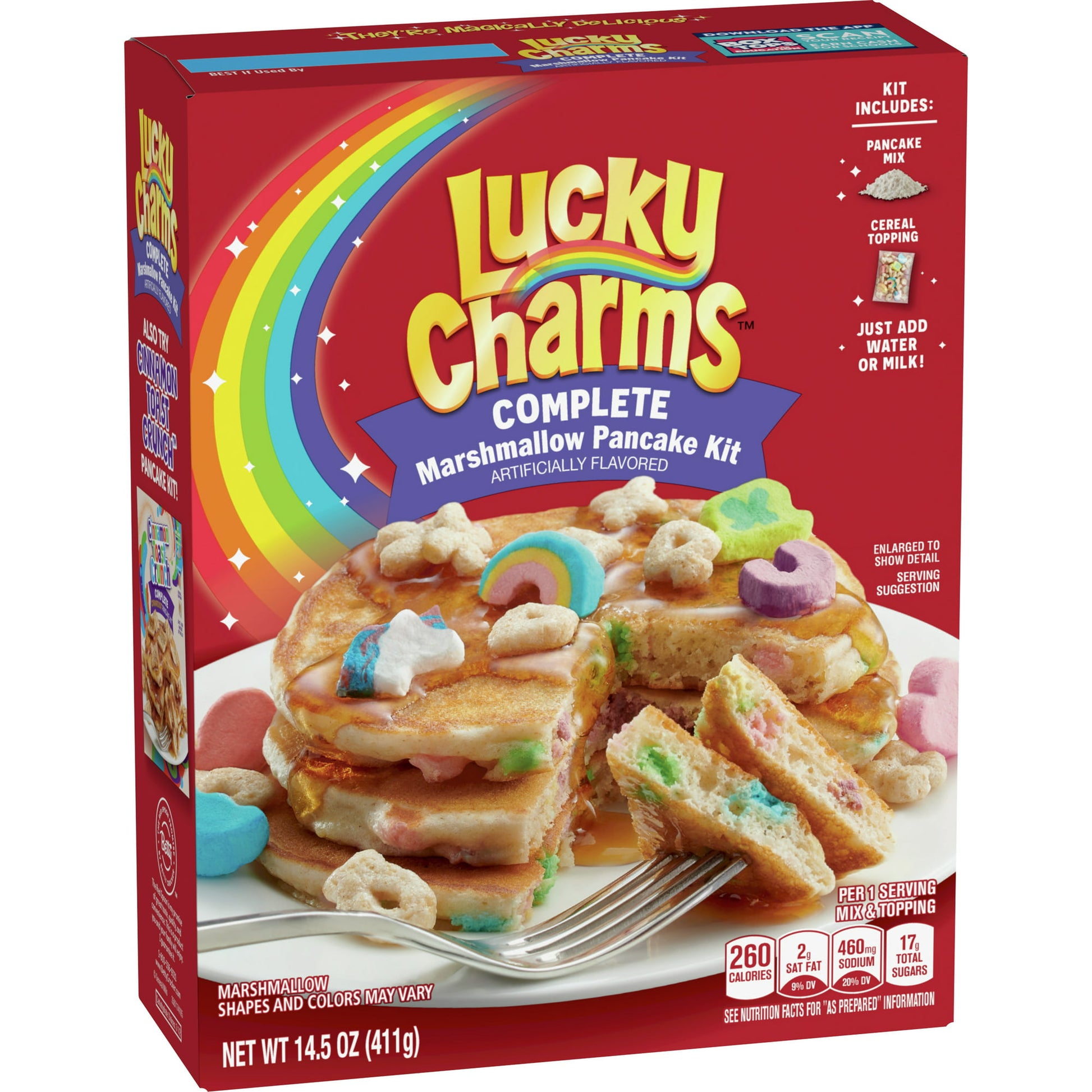 • JUST ADD WATER OR MILK: Simply add water or milk and delicious pancakes are only a few steps away; The kit includes pancake mix and Lucky Charms marshmallow cereal topping to top your pancakes