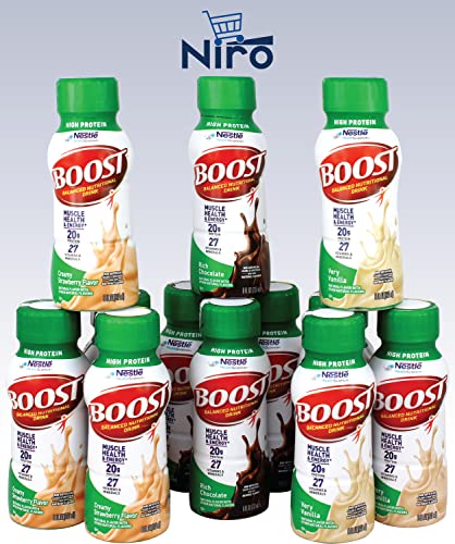 Boost Balanced Nutritional Shake Variety | High Protein | Boost Rich Chocolate, Boost Creamy Strawberry, and Boost Very Vanilla Flavors | 12 Pack | Niro Assortment | Included one Niro beverage sleeve