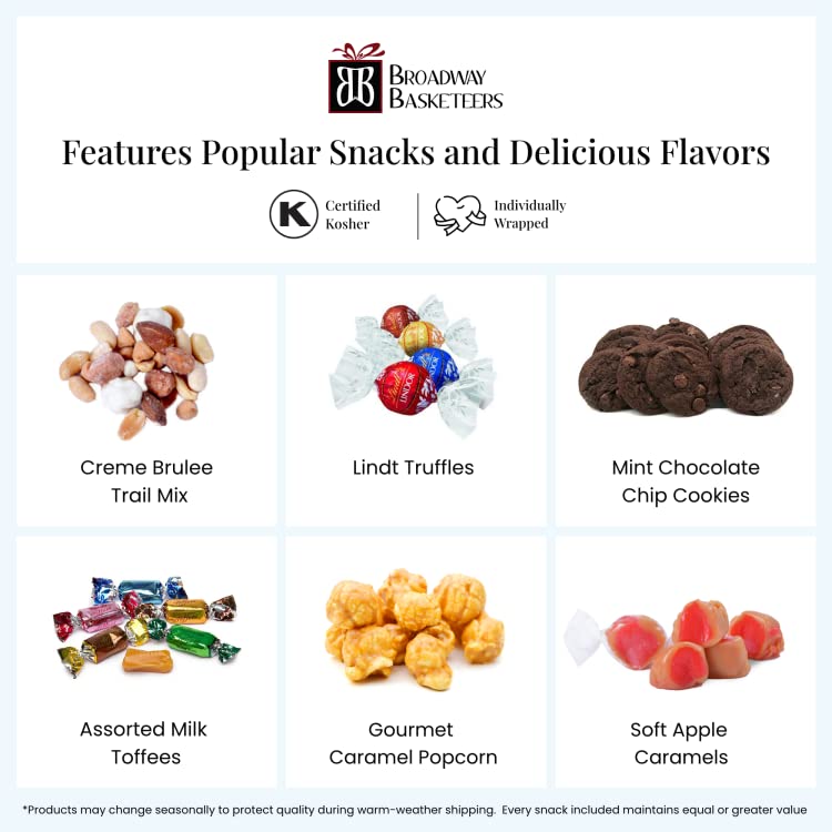 Broadway Basketeers Gourmet Food Gift Basket Tower for Birthdays – Curated Snack Box, Sweet and Savory Treats for Parties, Best Wishes, Birthday Presents for Women, Men, Mom, Dad, Her, Him, Families