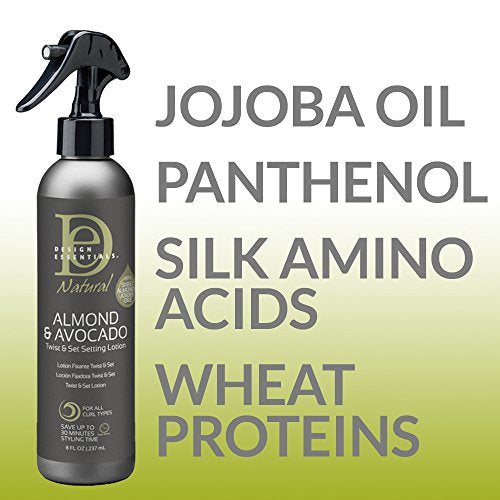Design Essentials Natural Twist & Set Setting Lotion Almond & Avocado. With sweet almond & jojoba oils. For all curl types. It is a ready-to-use setting lotion infused with panthenol and silk amino acids that easily create shiny long-lasting twist set and braid outs. Natural almond & avocado twist & set provides a medium hold, offers easy detangling and styling versatility for natural hair. Saves up to 30 minutes styling time. Contains no paraben, paraffin and mineral oil.