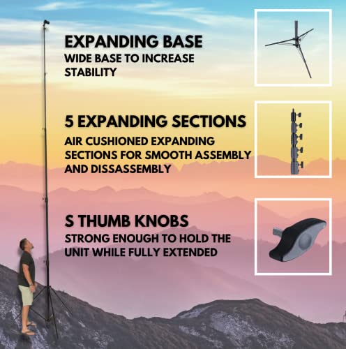 The supplied ¼” spigot enables you to mount various accessories on the TST20. With the addition of an optional thread adapter, a ball head or panoramic head can be mounted on the stand. Further, the SOLO SHOT is an ideal accessory to use in conjunction with the TST20. Minimal height: 171 cm Maximal height: 600 cm Collapsed length: 150 cm Sections Ø (mm): 45 / 40 / 36 / 31 / 28 Suspension: Air suspension Diameter legs (mm): 25 mm Spread: 138 cm Color: Black Weight: 5.1 kg Maximum load weight: 4 kg Diameter screw thread: 1/4" Aluminum construction for lightweight design and transport 20 ft Tall Aluminum Tripod Mast 5x 4ft air cushioned telescoping sections Light and 1/4 mounting options recommended payload up to 8 lbs