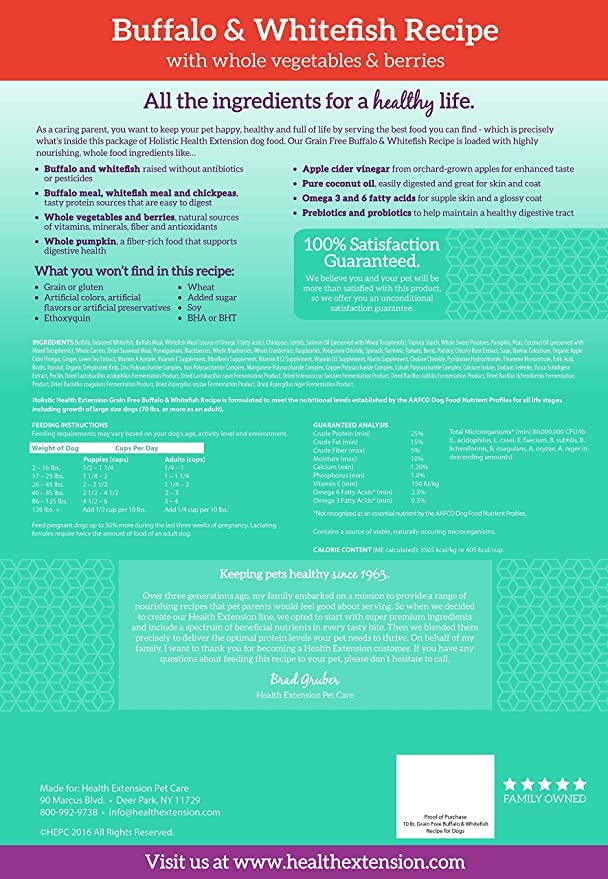 Prepared with delicious, whole food ingredients, our Grain Free Buffalo & Whitefish Recipe is packed with every nutrient canines need to thrive. Free range buffalo is the first ingredient, so you know your pet is getting healthy levels of animal protein in every bite. The second ingredient, deboned whitefish, is an excellent source of Omega 3's. This complete and balanced dry dog food also includes a hearty helping of chickpeas, whole garden vegetables and antioxidant-rich berries. Along with a proprietary blend of cutting-edge ingredients like turmeric, apple cider vinegar, natural probiotics and pure coconut oil. With nutrients like these, our Grain Free Buffalo & Whitefish Recipe offers everything dogs and puppies require for a long, healthy and happy life.