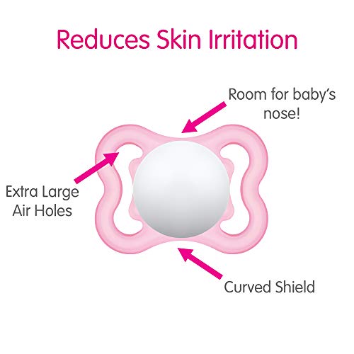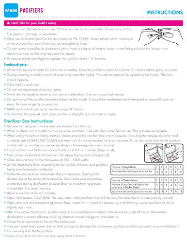 The MAM Mini Air Pacifier has a shield that is specially designed for babies 0-6 months with sensitive skin. The extra wide air holes allow plenty of circulation around your baby's mouth and even allow you to peek at their little smile. All MAM pacifiers for baby feature our trademarked SkinSoft silicone pacifier nipples that feel like mom and help babies transition from breast to pacifier. In fact, market research showed that MAM nipples are easily accepted by babies of all ages, with 94% nipple acceptance among babies tested*. The textured breastfeed pacifier nipple stays easily in baby's mouth and is just the right size for your girl and boy baby 0-6 months so their growing teeth, palate, and jaw will be safe. Additionally, the symmetrical orthodontic nipple shape means you won't have to worry about uneven pressure or fussing to turn the pacifier "right side up". Silicone pacifiers kept in the closed box will remain clean for up to 48 hours: Fill pacifier case with water. Place pacifier in the self-sterilizing case with the nipple facing down. Follow package instructions for microwave setting. Cool completely before use. *Market research 2010-2020, tested with 1,572 babies