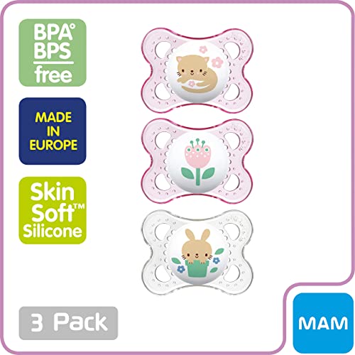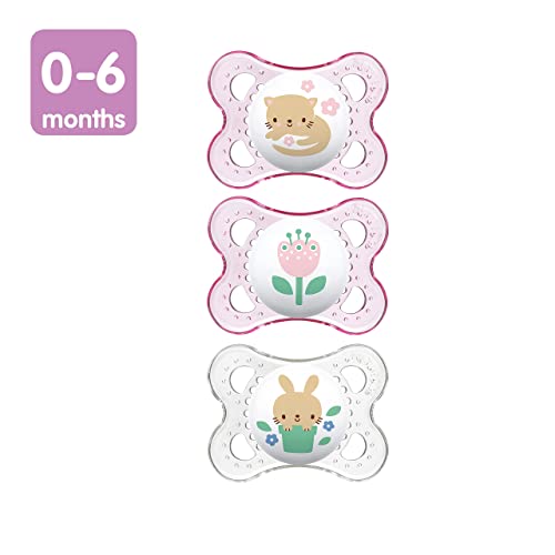 MAM Original Baby Pacifier, Nipple Shape Helps Promote Healthy Oral Development, Curved Shield to Protect Skin, 3 Pack, 0-6 Months, Clear/Girl
