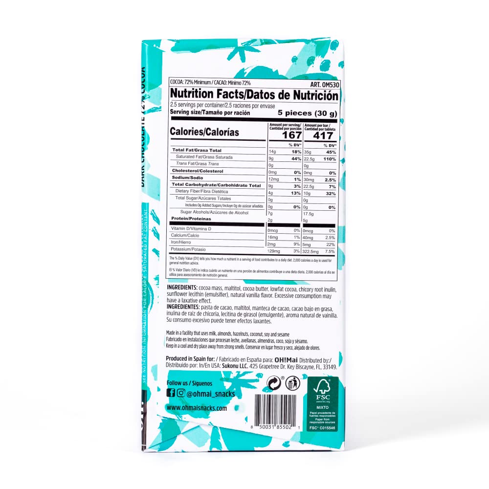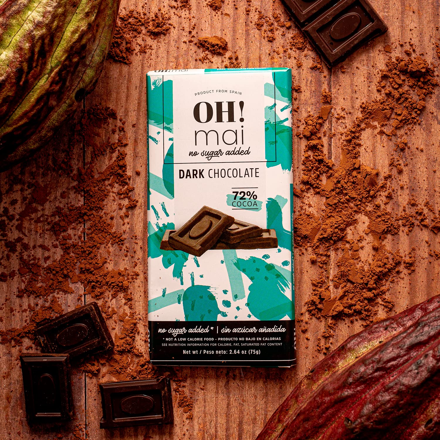 OH! Mai Dark Chocolate Bar 72% Cocoa 2.64 oz - No Sugar Added, Gluten Free Healthy Snack, Made in Spain (Pack of 12)