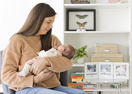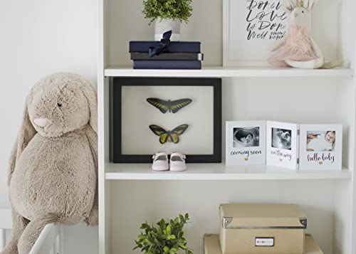 The Pearhead sonogram and baby photo desk frame is the ideal way to display your baby’s journey from the first sonogram photo to their world debut. As soon as those two lines appeared, you fell in love with your baby. You’ll want to cherish every step of baby’s journey until he or she makes their big debut. This ultrasound frame allows you to proudly display your baby’s first snapshots. This unique gift is the perfect creative baby gift. The white and black design blends beautifully with existing nursery décor. Personalize this sonogram frame with your baby’s progress. The triple picture frame features a folding design with hinges and a block base that stands on its own. Perfect to display your newborn frame on a desk or shelf. The first frame reads, “coming soon,” the second, “on the way,” and the third declares, “hello baby!” This sonogram picture frame is ideal for showcasing their first newborn photo. If you’re looking for baby gift ideas, baby shower décor, or baby decorations – make sure to include this sonogram keepsake on your baby gift registry. Every expecting parent will love this baby sonogram keepsake frame, so give this baby frame to any new parents in your life. At Pearhead, we aim to create genuine, quality products to celebrate your special moments in life. We are a family of designers, marketers, and trendsetters bringing products to life that will bring a smile to your face. From concept and design to production and customer service, the Pearhead team works together seamlessly every step of the way. Whether your baby is celebrating their first year of life, you are announcing your pregnancy, or your pup is celebrating his first holiday season, Pearhead is here to share your moments in style. Each frame block: 5.25”W x 5.5”H; Photo inserts: 3.5”W x 2.5”H.