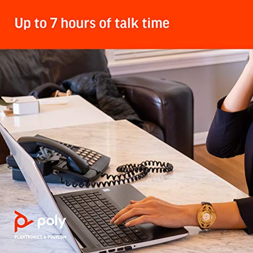 Manage desk phone calls up to 350 feet Wideband audio and noise-canceling microphone provide clearer conversations Three different wearing styles: over the ear, over the head, or behind the head One-touch call answer/end, mute, and volume adjust for simple call management Up to seven hours of battery life on one charge; adaptive power system helps conserve battery life