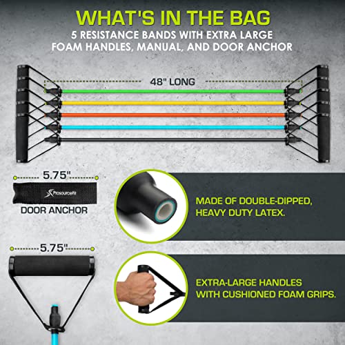 ProsourceFit Tube Resistance Bands with attached handles are a great alternative to free weights and workout machines. This resistance band set is light and compact enough to travel with you anywhere and supports some of the latest workout routines, including but not limited to P90X, P90X2, CrossFit, Slimin6, Insanity, TurboJam, and more. Made out of high-quality latex rubber to ensure each band will hold up to heavy use whether you're working your back, chest, arms, or abs. The bands offer 5 progressive resistance levels, making the set useful for everyone from beginners to experts. Resistance bands are also perfect for all types of physical therapy including the rehabilitation of torn rotator cuffs, bad elbows, and damaged knees. All bands measure 48 inches and include cushioned foam handles to ensure a secure, comfortable grip. Plus, the bands come with a convenient door anchor, so you can do your exercises anywhere in the house. Train like a Pro, train with ProsourceFit!