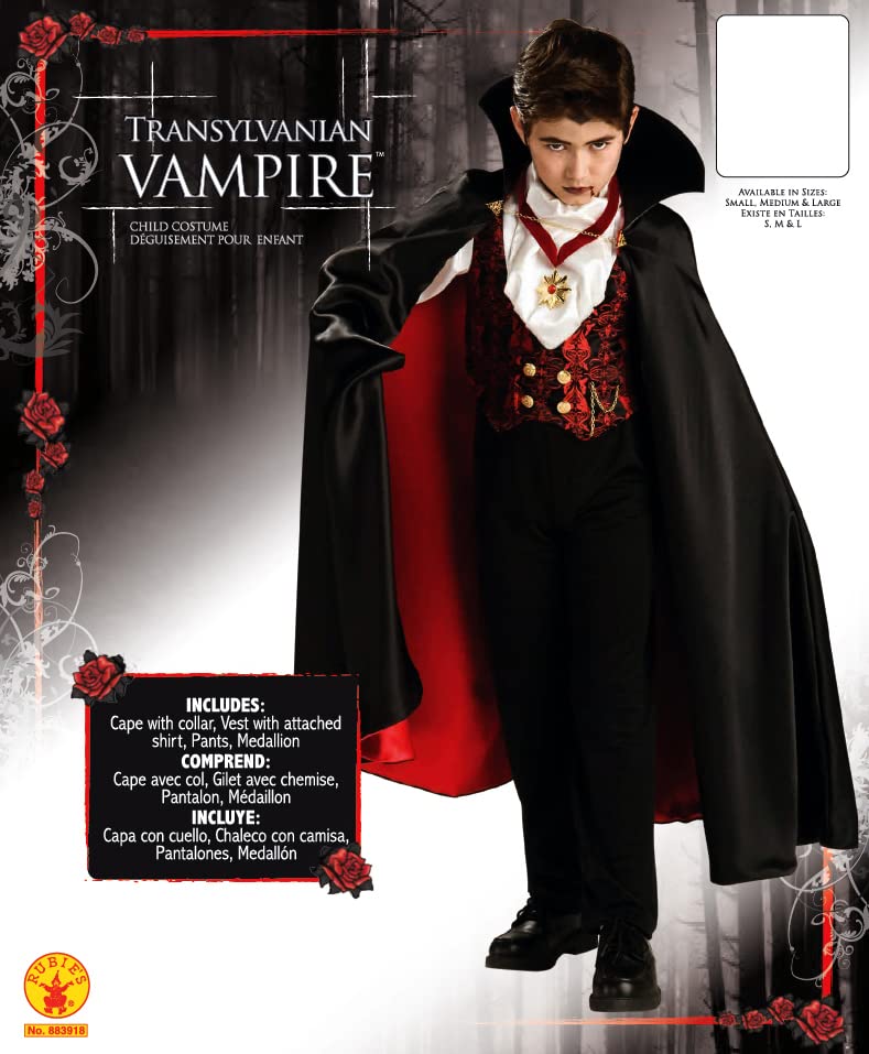 You may not own an ominous dark castle isolated on the cliff tops, but you can sure look the part. This classic vampire attire, with a red vest, white shirt, and black cape, will make anyone thirsty for a certain red liquid. Available in children's Small (size 4 to 6), Medium (size 8 to 10), and Large (size 12). Rubies brings fun and fantasy with quality costumes and costume accessories, offers the broadest selection of products, and to promotes safety in dress-up.