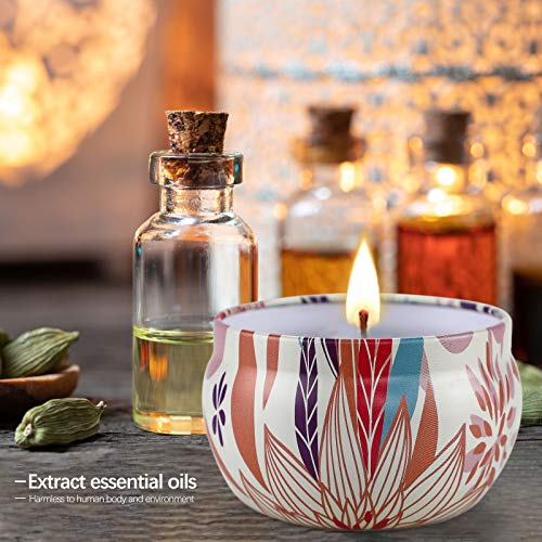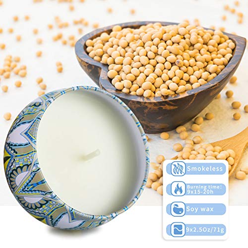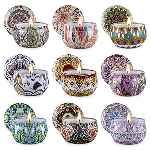 9 welcome fragrances,scented candles sets includes 9 popular scent.English toffee, cranberry cloves, lavender, lemon verbena and citrus, teak, saffron and sandalwood, figs and fir, winter moss mahogany, vanilla ice cream.,Soy wax candles,made of soy wax and lead free fiber cotton core, it use evenly and fully.,Long lasting candles,2.5 oz soy wax per candle,long lasting 15 to 20 hour time,9 Pack working time 135 hours.,Perfect candles gift sets,our scented candle set is beautifully packed and ideal for gift giving. It is the perfect ideal gift for birthdays, holidays, valentines day, thanksgiving, mothers day and christmas.,Suitable for most occasions. this jar aromatherapy candles is the best choice for spas, yoga studios, bedrooms, bathrooms and table decorations and lighting.