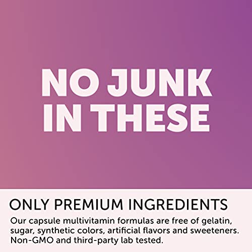SmartyPants Capsules Women’s 50+ Multi contains over 20 premium nutrients and minerals to support your brain, heart, bone, eye, energy and immune health – all in one easy-to-take vegetarian capsule. Women’s 50+ Multi contains omega-3 DHA from algal oil for brain health, vitamin D3 for bones, vitamins C, B6 and zinc for immunity, folate as methylfolate for heart health, vitamin B12 to support energy metabolism, vitamin A for eye health, biotin to help maintain healthy hair, skin and nails, and the antioxidant vitamin E. Women’s 50+ Multi is non-GMO, gluten-free and sugar-free.