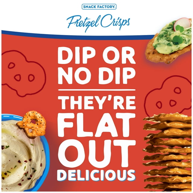 Dip or no dip, Snack Factory Everything Pretzel Crisps are flat-out delicious. Our Everything Pretzel Crisps are generously sprinkled with poppy seeds, onion, garlic and salt. How much more flavor could you want? A modern, gourmet twist on an old favorite, these thin and crunchy pretzel chips give you the best part of traditional pretzels without the doughy center. They’re perfectly seasoned and baked just right for a hearty, satisfying crunch in a slim, sturdy shape that's dippable, toppable and deliciously snackable. Snack Factory Everything pretzel thins are tasty on their own and they hold up to almost anything, so they pair perfectly with hummus, cheese or any of your favorite dips. For that Everything bagel flavor, try them with cream cheese. Looking for a quick and easy appetizer idea for your next party? Top these flat, thin pretzels with warm spinach and artichoke dip, microgreens and radish to create tasty Farmer’s Fiesta bites. Snack Factory Pretzel Crisps are made with quality ingredients and are Non-GMO Project Verified. This 7.2-ounce bag contains about 7 servings and is perfect for stashing in your pantry so you can satisfy your cravings for salty snacks. Since they’re so incredibly versatile, our pretzel crackers are also ideal for serving to guests. In addition to Everything, Snack Factory pretzel chips are available in other unique flavors such as Buffalo Wing, Garlic Parmesan and Cheddar Cheese. Shelf-stable/ambient.
