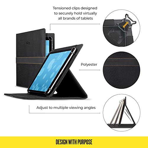 Solo Metro Universal Tablet Case fits tablets 8.5” to 11” tablets and easily adjusts to multiple viewing angles. The magnetic strap ensures that the case stays closed when shut. The polyester material makes it easy to clean. 1 year warranty.