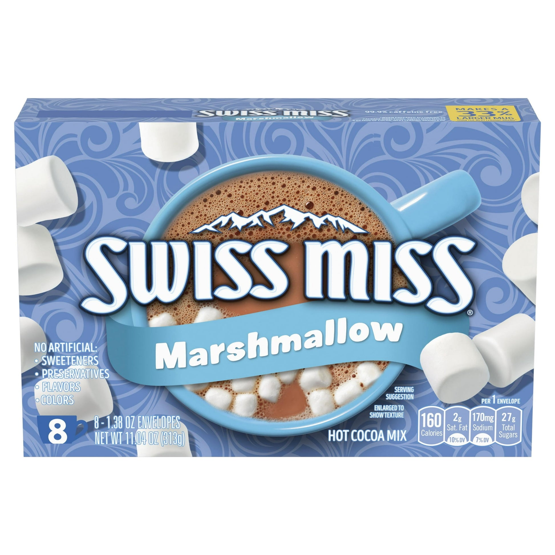Swiss Miss Chocolate Hot Cocoa Mix With Marshmallows makes a warm, delightful hot cocoa drink with mini marshmallows that will bring you comfort and everyday warmth whenever you need it. This hot cocoa drink mix easily transforms into a rich, creamy hot cocoa with marshmallows that delivers on that timeless flavor your family has always known and loved. Swiss Miss Hot Cocoa Mix is packaged in 1 Envelope Packets, so every mug you make is equally delicious. You won't miss your old hot chocolate with marshmallows. This chocolate hot cocoa powder is made with real cocoa and nonfat milk to give you that comforting, rich and creamy taste you expect from Swiss Miss. Not only is this a gluten free hot cocoa mix, but it's made with no artificial sweeteners, preservatives, flavors or colors. Preparing a delicious mug of this hot cocoa is easy. Empty the chocolatey cocoa mix into a mug, add 8 ounces of hot water (or milk for a richer taste) and stir. Enjoy a mug as part of your morning routine, on chilly days or as a sweet evening treat. You can use this cocoa mix in different ways. Try making a tasty iced cocoa drink to cool you down, or incorporate the hot cocoa mix into your recipes for brownies, cookies, cakes and more. Whatever you?re warming up to, know that Swiss Miss will give you everything you need in the palm of your hands.