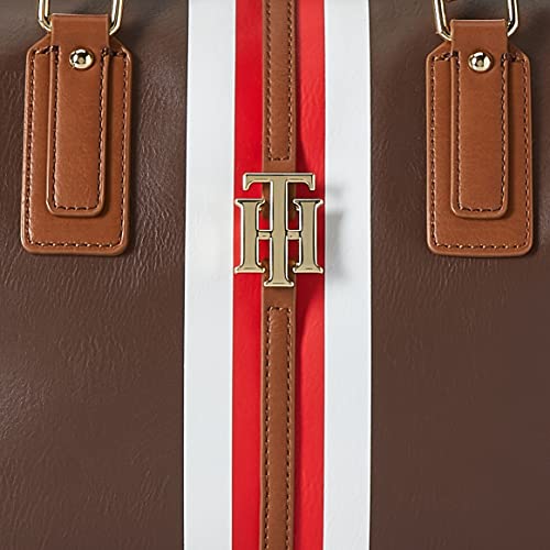 Top handle satchel handbags for women featuring the Tommy Hilfiger women signature flag stripe and gold TH hardware. Double top handles and removable convertible strap with gold hardware details. Flat bottom, top zip closure. Lined nylon interior with wall zip pocket and slip pocket. This Tommy Hilfiger bag is a versatile essential, perfect for your next work bag. Our timeless Tommy Hilfiger handbag is a stylish addition to your collection of top handle handbags. 13-3/4" length; 8-1/2" height; 5-1/2" width; 3-3/4 23-1/2" drop.