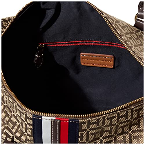 Top handle satchel handbags for women featuring the Tommy Hilfiger women signature flag stripe and gold TH hardware. Double top handles and removable convertible strap with gold hardware details. Flat bottom, top zip closure. Lined nylon interior with wall zip pocket and slip pocket. This Tommy Hilfiger bag is a versatile essential, perfect for your next work bag. Our timeless Tommy Hilfiger handbag is a stylish addition to your collection of top handle handbags. 13-3/4" length; 8-1/2" height; 5-1/2" width; 3-3/4 23-1/2" drop.